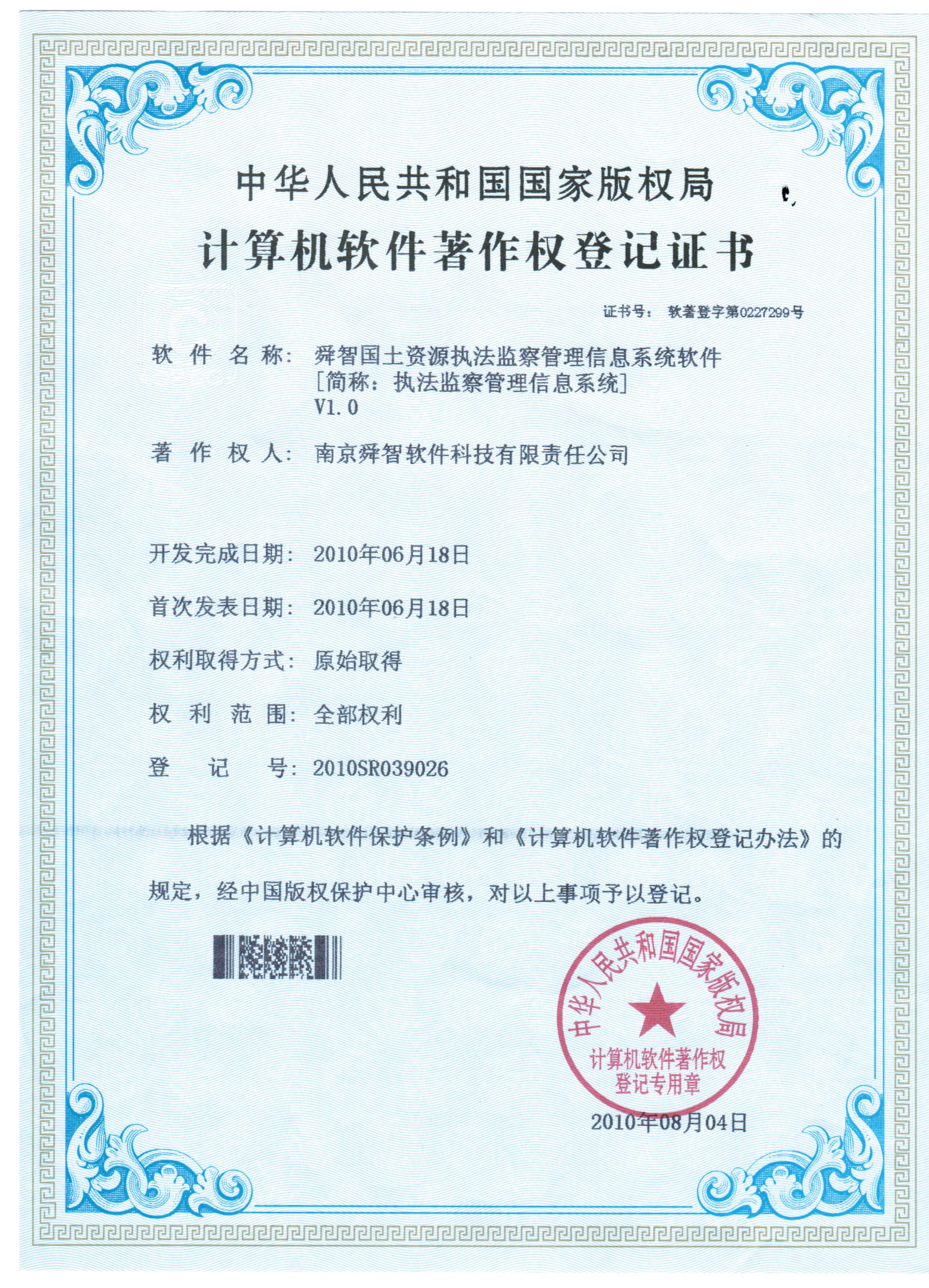 公司自主研发的“舜智国土资源执法监察管理信息系统软件”于2010年8月取得计算机软件著作权登记证书。 |