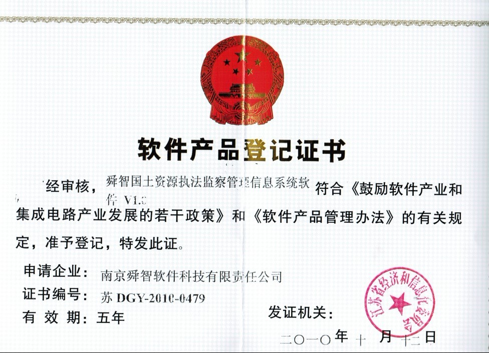 公司自主研发的“舜智国土资源执法监察管理信息系统软件”于2010年10月荣获“软件产品登记”证书。